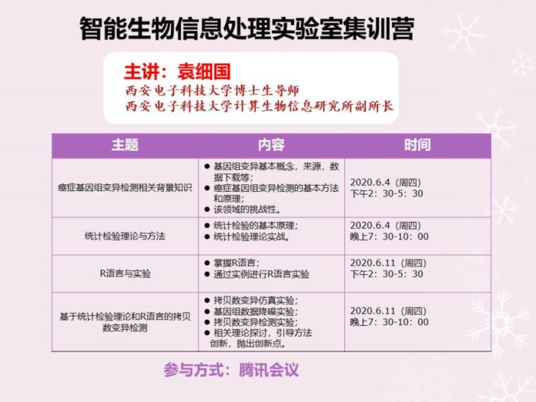 窗体顶端为帮助我院智能生物信息处理团队尽快在此研究领域取得成果,在学院的大力支持下,2020年6月4日至6月11日,举办了智能生物信息处理实验室首期集训营。对于本次集训营,学院进行了认真筹备和组织,在全院老师中进行了广泛地动员,发布了集训营海报: