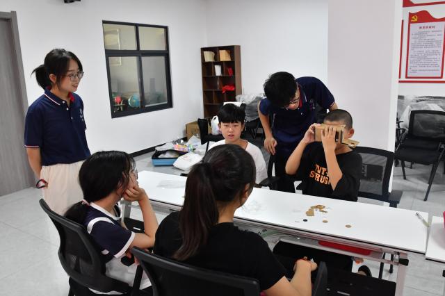 上午,志愿者刘浩结合PPT和特效视频,运用通俗易懂的语言和丰富有趣的事例向小朋友们介绍了虚拟现实技术(VR)的原理、分类及特点,带领小朋友们踏入充满科技感和未来感的VR科技世界,更直观地感受先进科技的魅力。在互动环节中,小朋友们在志愿者专业且耐心的引导下,亲自动手实践,一步步细致地组装起简易VR眼镜,一段段3D特效的动画视频在VR眼镜中生动展现,瞬间将小朋友们带入了一个全新的维度,让他们领略到了前所未有的视觉盛宴与沉浸体验。此环节不仅让小朋友们深刻感受到VR技术的独特魅力,了解了其中的科学原理以及其在现实中的应用,更在他们心中播下了探索未来科技的种子,激发了小朋友们对科学技术的好奇心和基础理解,在实践中培养创新精神和协作精神。