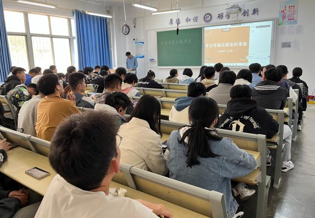 此次讲座特邀粉笔教育职业规划师王方明为主讲人,为同学们指点迷津、解疑答惑。王方明从当今的考公、考研、考编形势出发,分析当前就业趋势,详细讲解各类就业渠道及职业发展方向,对社会各行各业的就业备考进行精确指导。结合现阶段各单位对公务员的需求,王方明为同学们介绍了考公的主要形式,包括国考、省考、选调生考试,重点指出了三类考试的共同特点和区别以及准备的应考时间,并强调笔试环节和面试环节的考核特点,让同学们更加明晰了考公的规则要求以及备考技巧。根据今年考研现状,王方明深入剖析有关考研的突出性问题,包括近几年全国硕士研究生招生和录取的情况、考研复习需要掌握的储备知识及考研各个时间段需要学习的内容,为在场同学们分享了面试的技巧和注意事项。依据当今教师行业的发展前景,王方明讲述考编的特点和方向,介绍了教师编的社会就业趋势、招聘考试形式和招聘报考条件,他强调同学们应认真解读国家出台的相关政策,从宏观上把握就业趋势,同时参考往届学长学姐的就业去向,慎重选择职业。讲座最后,同学们受益匪浅,纷纷表示会做好规划蓝图,探索更多未知空间,以自信的姿态和昂扬的态度迎接未来的挑战。