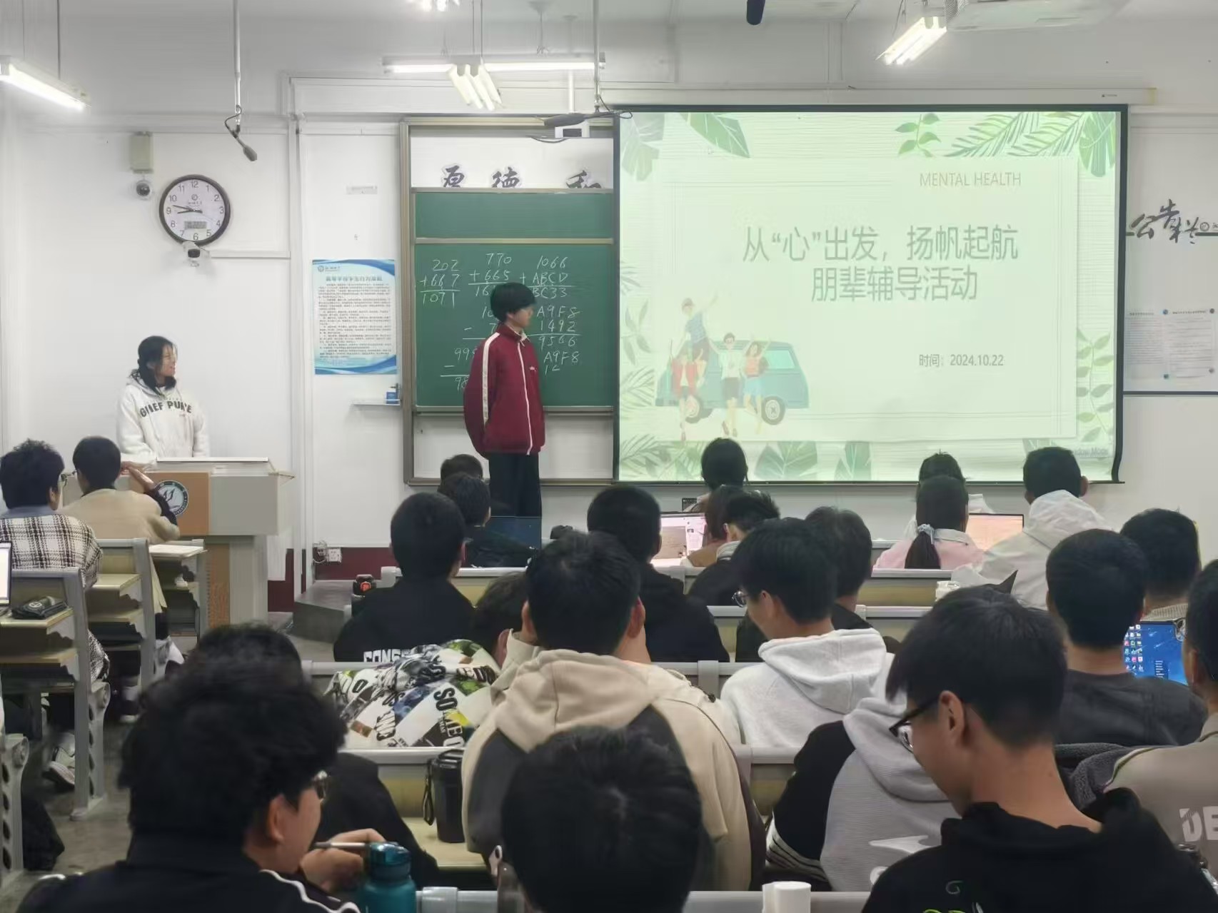 朋辈辅导活动主要围绕心理健康概述进行了深入阐述,内容涵盖心理健康的定义、心理健康的评判标准、大学生群体中常见的心理问题以及个人如何有效维护自身心理健康等四个方面。活动伊始,主讲人以“生命,你好”作为开场白,深刻阐述了生命的宝贵价值,向在座的同学们传递了珍视生命的理念。随后,主讲人向同学们介绍了心理健康的概念、心理健康的重要标准,以及大学生常见的心理问题,引导同学们更全面地认识和理解心理健康的重要性。最后,主讲人着重分享维护个人心理健康的有效策略,包括培养良好的人格特质、积极参与课外活动等实用建议,并勉励同学们在遇到心理困扰时,能够主动寻求老师与同学的帮助与支持。活动过程中,同学们全神贯注地聆听讲解,积极参与讨论环节,为心理健康教育工作贡献了许多富有建设性的意见和建议。