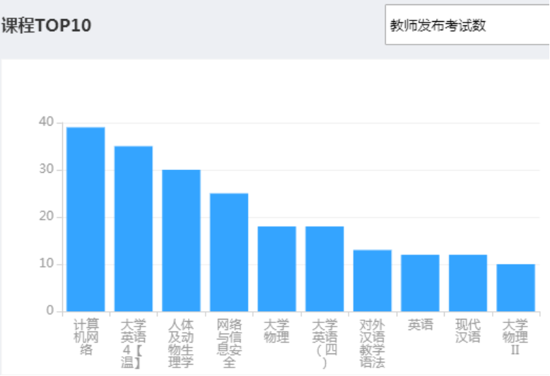 图2是本学期全校老师自建课程的课程发布考试数院系对比,我院老师发布的最多,排在第一位(柱状图最下面),是70次。图3是全校老师自建课程发布考试数TOP10排名,《计算机网络》排第一位,这门课是我院的专业核心课。应该说,全院老师们付出了较之正常教学更多的精力和辛劳,向他们致敬!