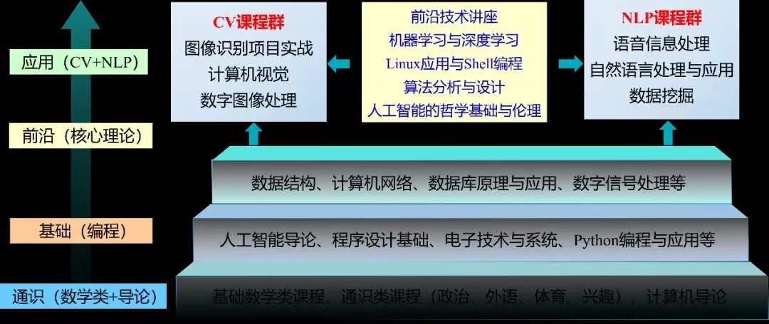人工智能导论、程序设计基础、数据结构、计算机网络、人工智能的哲学基础与伦理、数据库原理与应用、Python编程与应用、数字信号处理、数字图像处理、机器学习与深度学习、自然语言处理与应用、计算机视觉、团队激励与沟通、图像识别项目实践、语音信息处理、人工智能综合实践、项目运维综合实践等。